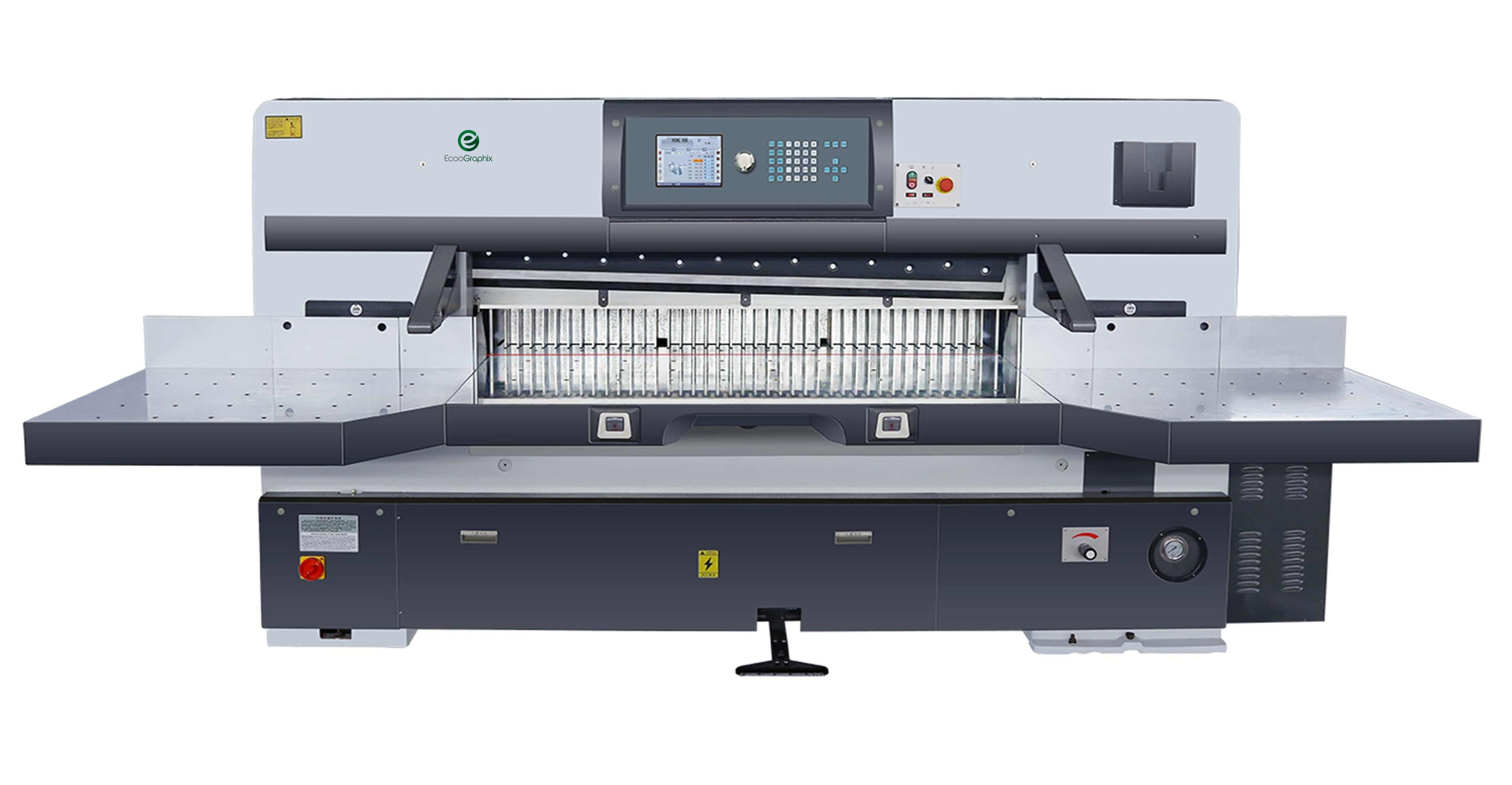 Ecoo 1150DH is de automatische dubbele hydraulische, dubbele gids papier snijmachine, voornamelijk voor A1/B1 vellen.